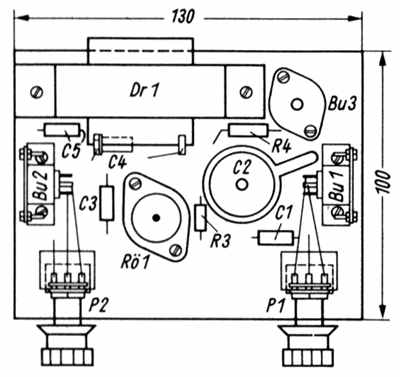 Die verstärkte Nf-Spannung wird über C 3 zum Tiefpaßfilter C 4, Dr.1, C 5 und von dort über P 2 zum