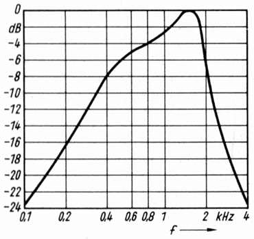 Die Frequenzkurve zeigt bei 300 Hz einen starken Abfall der tiefen und bei 2500 Hz einen ebenso starken Abfall der hohen
