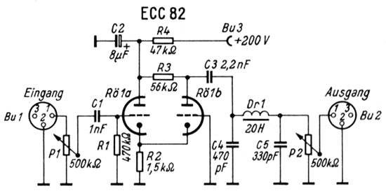 Von Anschluß 1 der Buchse Bu 1 gelangt die Nf-Spannung über P 1, C 1 - dieser Kondensator senkt die Tiefen ab -