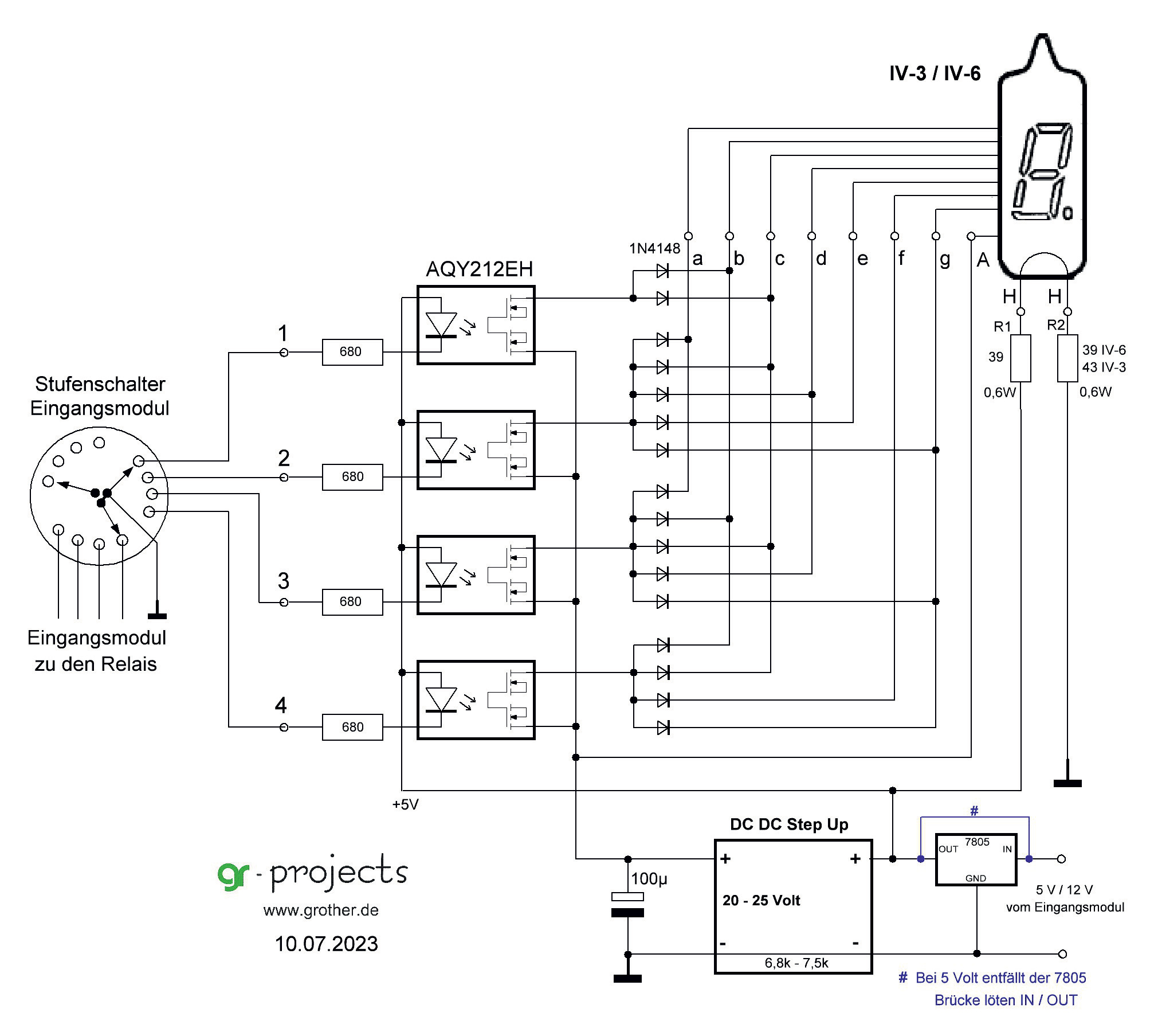 Hier ist die Kanalanzeige mit Led´s realisiert - nicht stilgerecht für Röhrenverstärker. Ich habe eine Anzeige realisiert mit VFD Röhre die den eingestellten Kanal 1 - 4 anzeigt Die Schaltung: