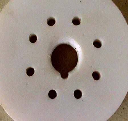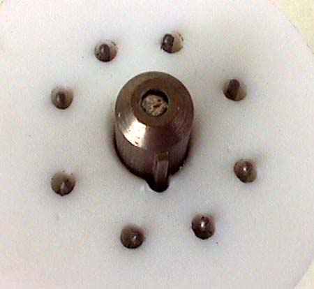 Das folgende Bild zeigt, in Vergrößerung, die von mir fertig gebohrte PTFE-Scheibe für die LS 50.