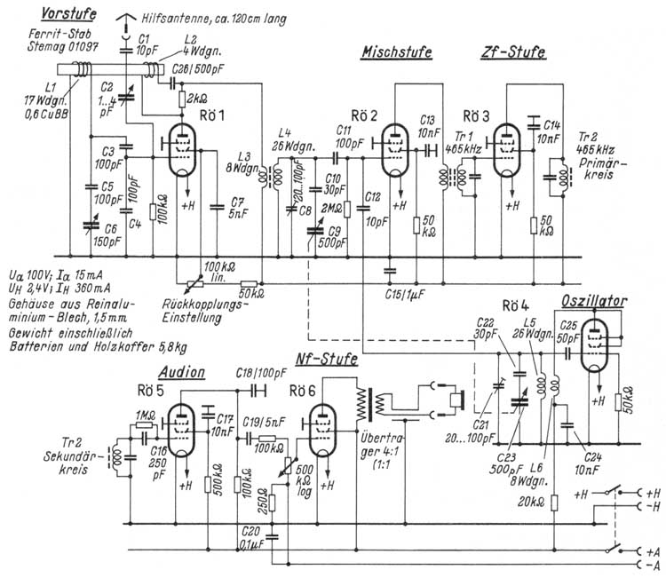 Die additive Mischung ergibt sich aus der Verwendung von Pentoden. Die Tonfrequenz wird mit einem Audion aus der