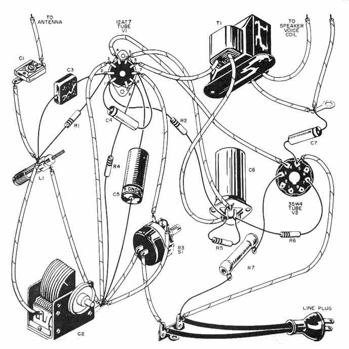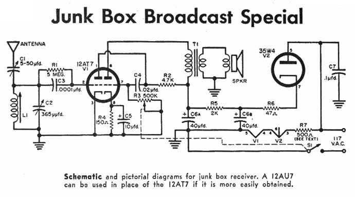 Schaltung eines einfachst aufzubauenden Einkreisempfängers, er wurde unter dem Namen Junkbox veröffentlicht.