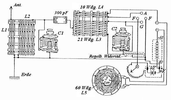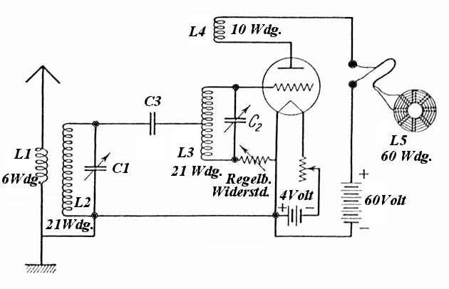 Es ist im Anodenkreis eine Spule L5 von ca. 60 Windungen vorgesehen, die mit der Empfangsspule des Rundfunkempfängers