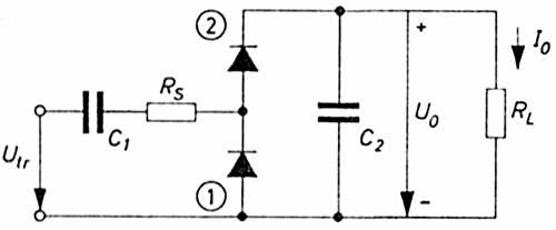 In der ersten (positiven) Halbwelle wird der Kondensator C 1 über die Gleichrichterzelle 1 aufgeladen, in der zweiten