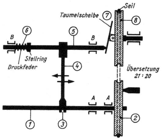 verschiebbar. Sie wird mit der Feder 6 gegen eine Taumelscheibe 7 gedrückt, die mit dem Seilrad 8 verbunden ist und