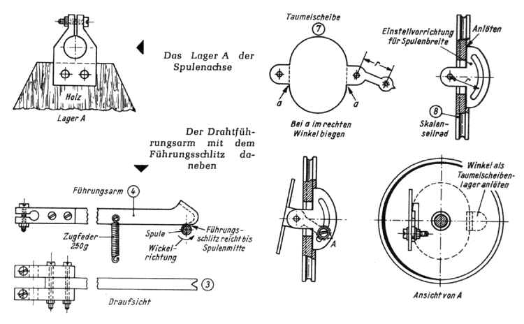 Der Spulenkörper wird auf die Achse l (in den beiden Lagern A) gesteckt und mit dem Kurbelrad 2