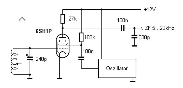 Sie Schaltung zeigt eine Mischstufe mit einer Röhre. Am Eingang liegt ein auf die Empfangsfrequenz abgestimmter