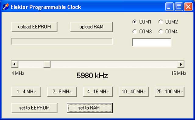 Hier wird jedoch ein programmierbarer Quarzoszillator aus Elektor 2/2005, der im Bereich 1 MHz bis 100 MHz eingestellt werden
