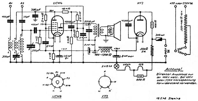 Er ist bestückt mit einer UCH4 und einer VY 2. Die Heptode ist als rückgekoppeltes Audion und die Triode als