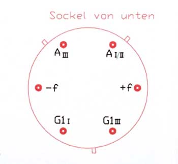 Jetzt komme ich ans verlöten der Anschlußkabel. Dazu muß ich erst die Sockelbelegung wissen:
