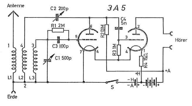 Schaltung: Rückkopplungs-Audion mit Niederfrequenz-Verstärker. Wellenbereich: 520 - 1610 KHz (Mittelwelle).