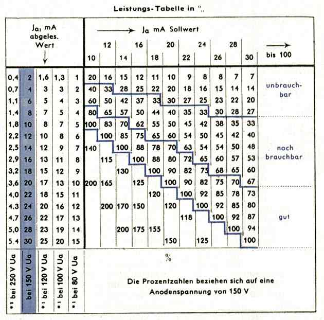 Röhren mit Gittervorspannung wird die Leistung in Prozent mit Hilfe der Leistungstabelle ermittelt.