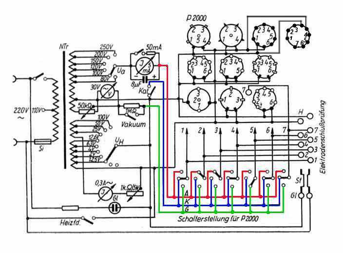 Jede Elektrode von 1 bis 7 führt zu je einem Dreifachschalter, der wahlweise auf Anode (rote Leitung A), Kathode