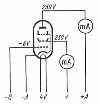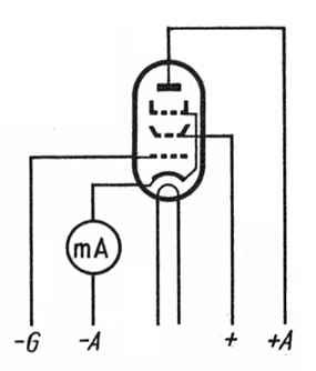 Bei der Prüfung legt man einen Widerstand von 1...2 MOhm an das Steuergitter - siehe nächste Bild -, an dem ein