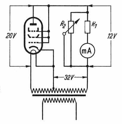 An der Anode und damit an den Gittern der zu prüfenden Röhre sind nur 20 Volt wirksam, da am Instrument und