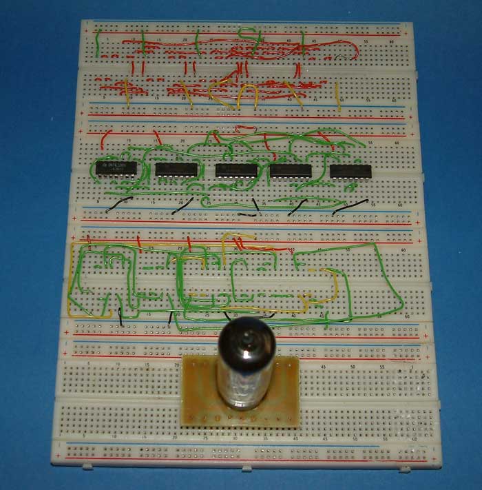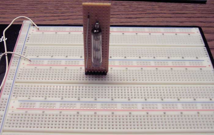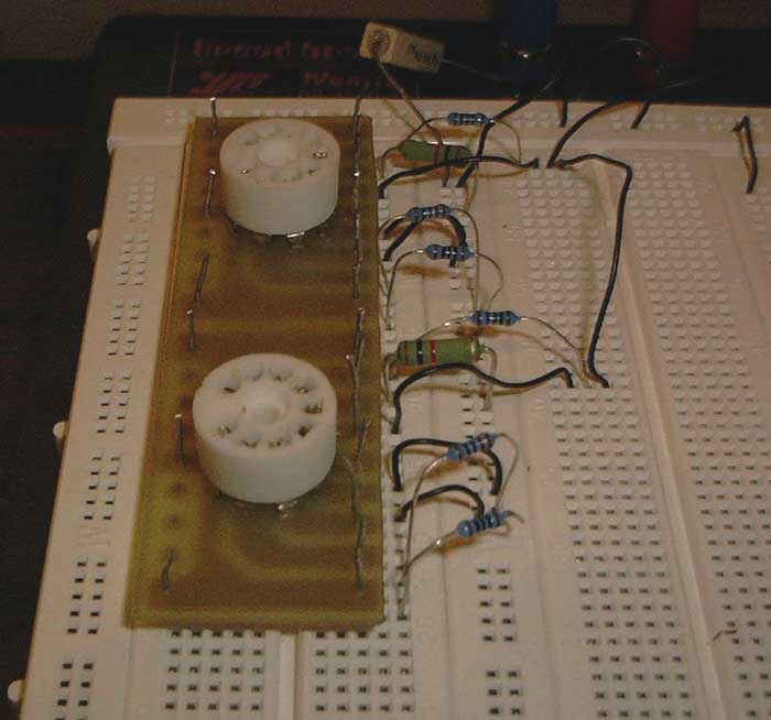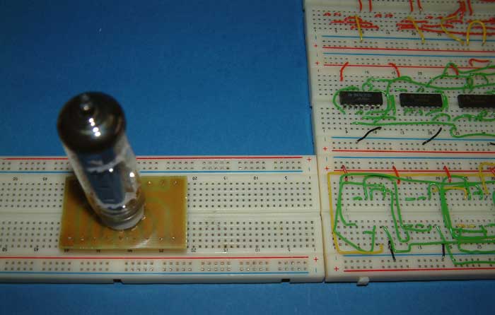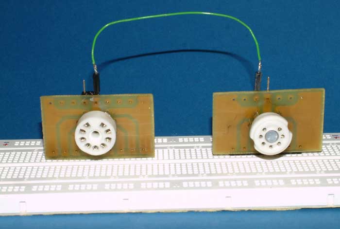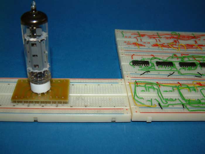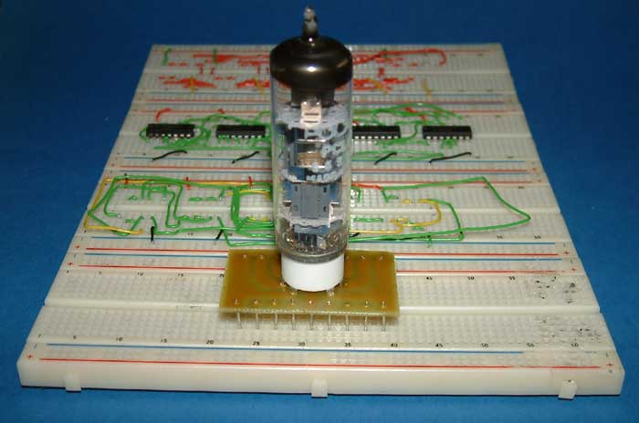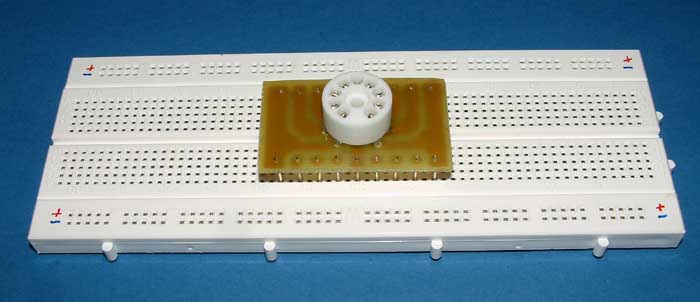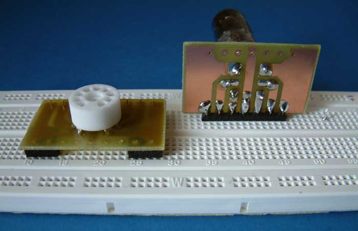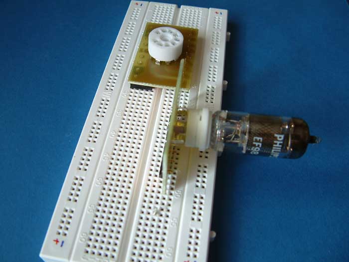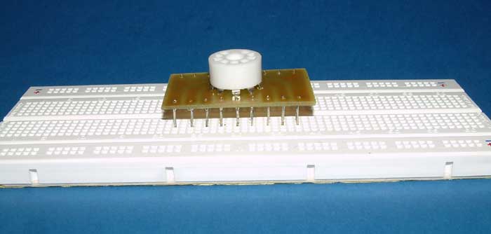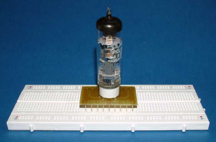 Die folgenden Fotos zeigen nun die Röhre-Adapterplatine mit der PCL86 auf dem anderen Steckbordsystem, der Hersteller