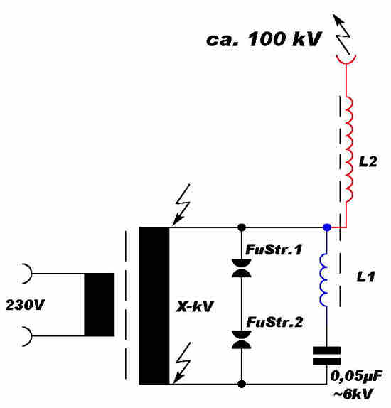 Links im Schaltbild der Streufeld-Transformator. In der Mitte, mit FuStr1 und FuStr2 bezeichnet, die beiden Funkenstrecken.