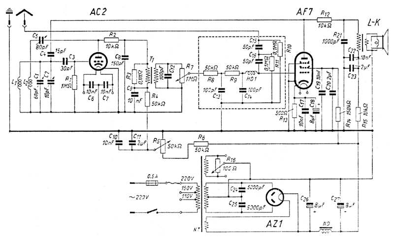 Niederfrequenz-Wechselspannung erfährt im NF-Verstärker mit der Röhre AF 7 eine für