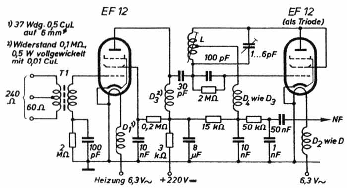 Wie das Schaltbild zeigt, ist in jede Heizleitung der beiden Röhren eine Siebdrossel mit je 37 Windungen