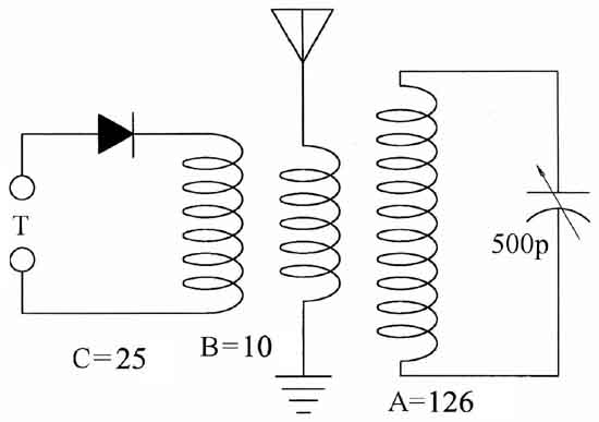 Die Verbindungen die die Spule mit dem Drehkondensator auf der Frontplatte, mit Antenne und Erde sowie mit Detektor und