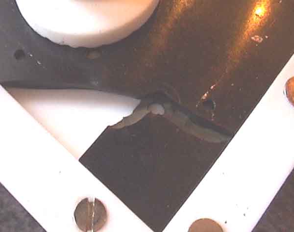 Hier der Drehkondensator in einer Nahaufnehme. Deutlich erkennbar nun der abgebrochene Teil der Kontaktfeder, die den