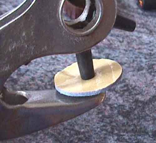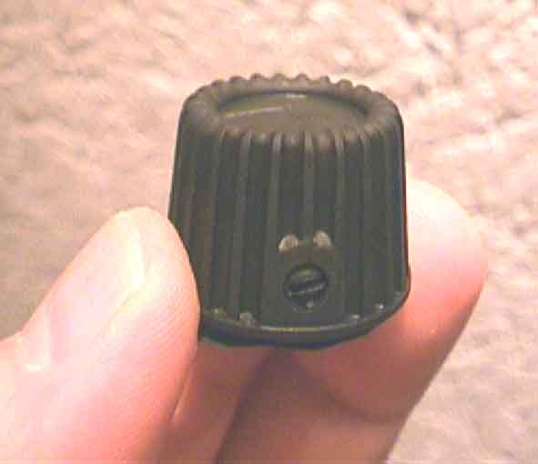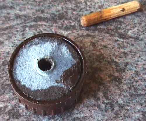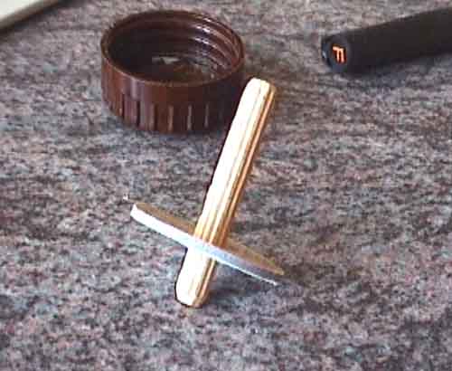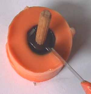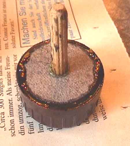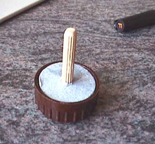 Um den Knopf halten zu können, habe ich einen 6-mm-Holzdübel als Achse in den Knopf gesteckt und mittels der
