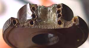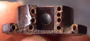 (Kugelkopf-Fräser) kleine Löcher seitlich in die Bruchkante gebohrt, hier soll später das Gießharz