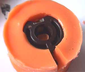 Der defekte Knopf wird sorgfätig und vorsichtig in die Silikonform eingepasst.