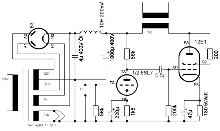 Dazu gibt`s nicht viel zu sagen, die 12E1 wurde zu Triode geschaltet, der Rest ist auf ein Minimum reduziert. Die