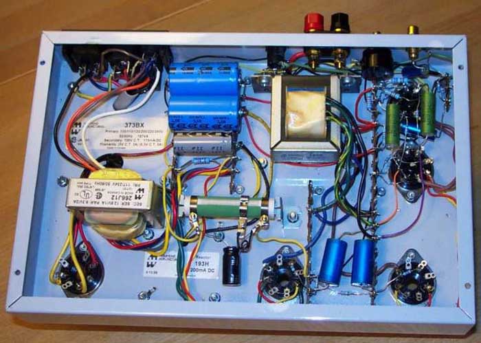 Aufgebaut ist der Verstärker auf einem Stahlblechchassis der Fa. Hammond, wobei Röhren, Netztransformator,