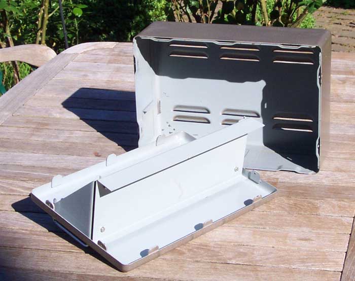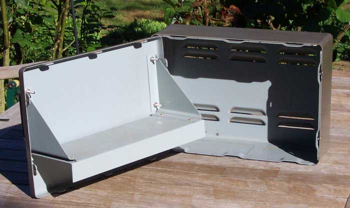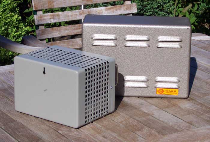 Das zweite ist ein Transformatorengehäuse mit Perforationen im Deckel, Boden und Seitenwänden; eingebaut ist ein