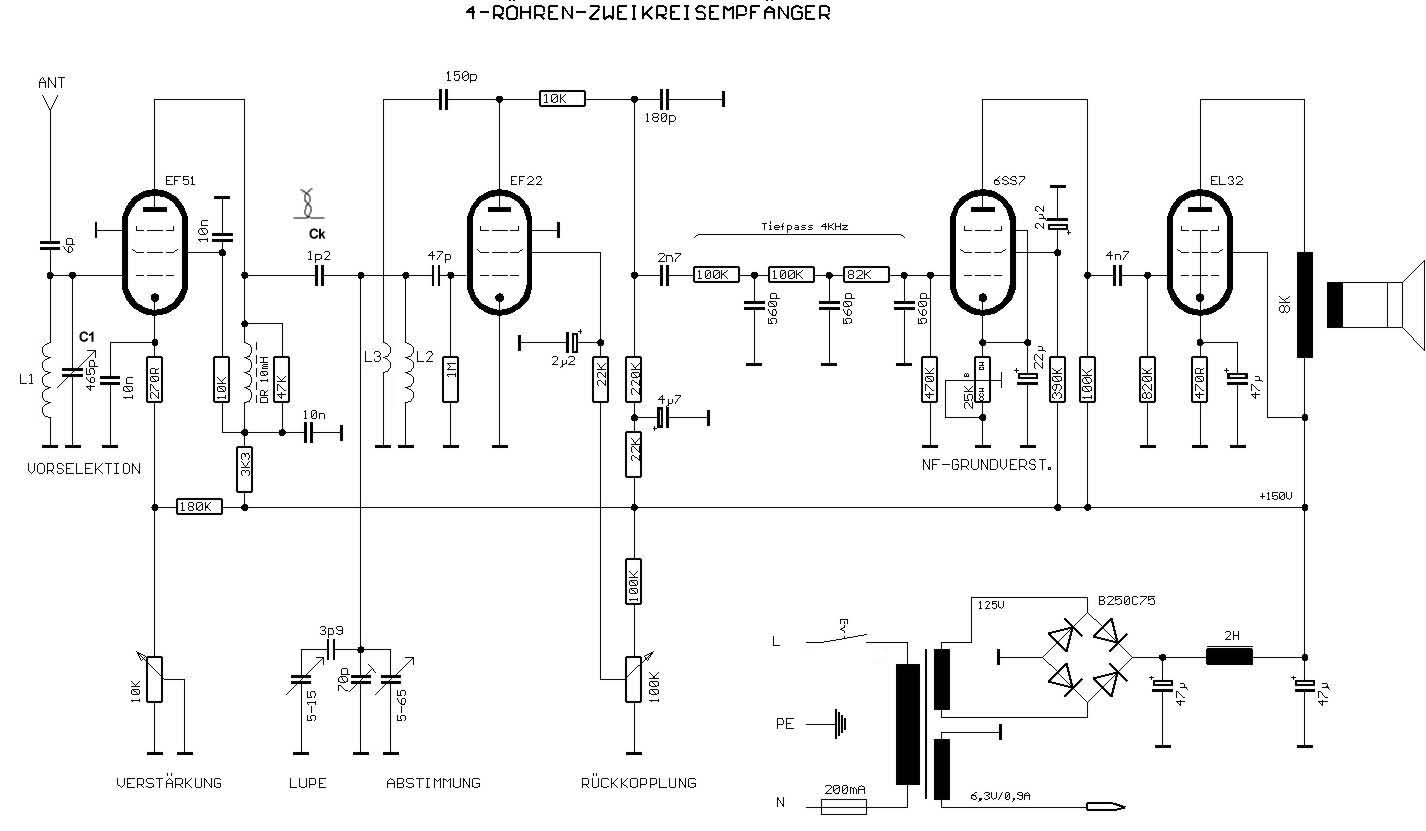 Kopplung an das Audion. Im Kathodenkreis sorgt ein 10 k-Poti für die Verstärkungsregelung des gesamten