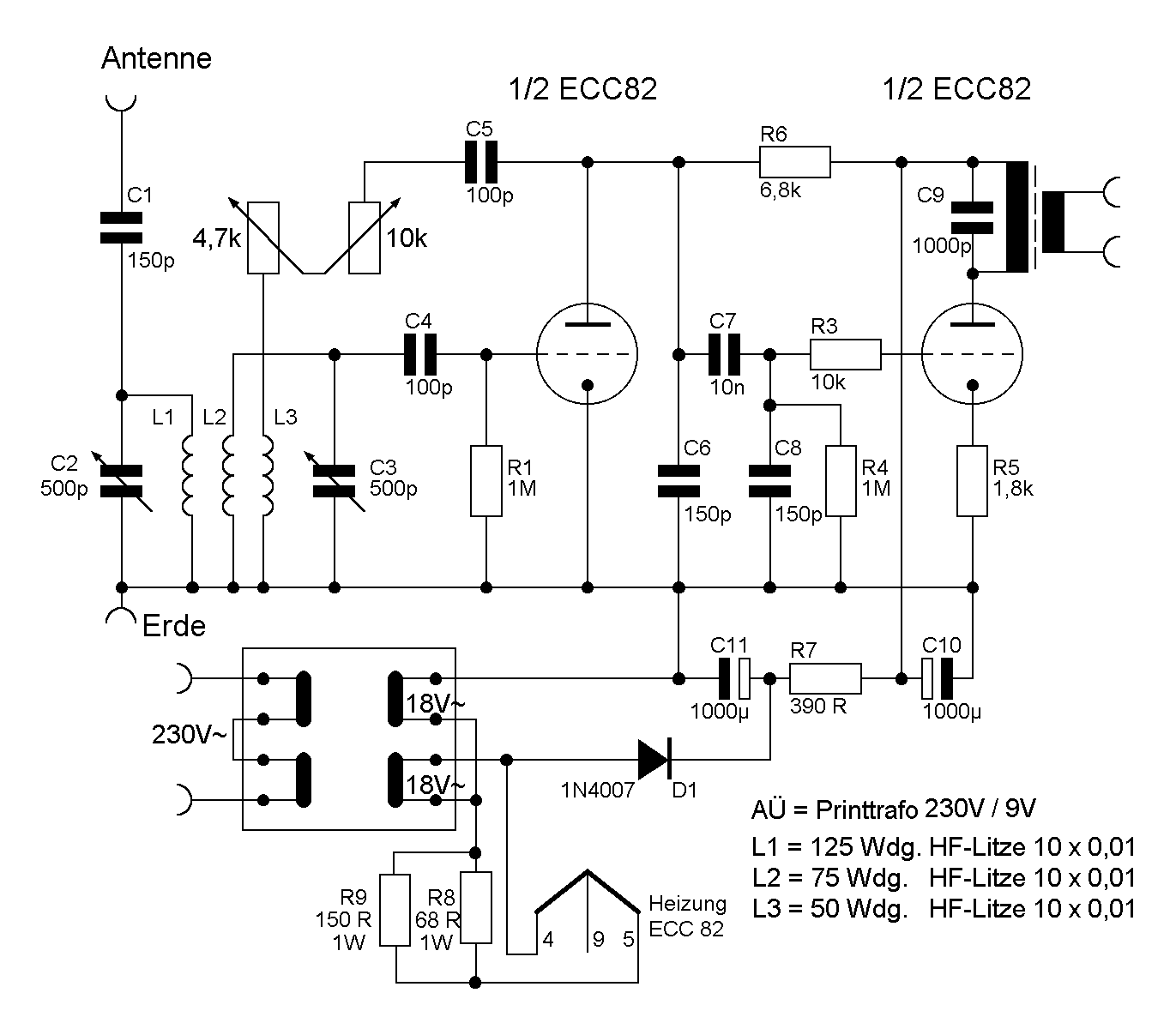 Die Schaltung zeigt einen so genannten Geradeaus-Empfänger, aufgebaut mit der Zweifach-Triode ECC 82.