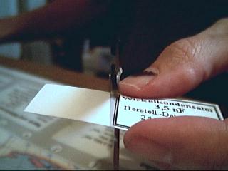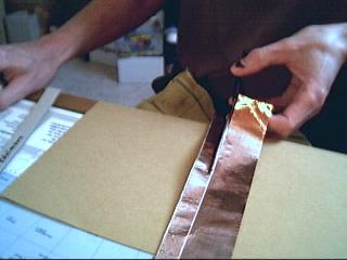 Die beiden Cu-Folien auf die beiden jeweils dafür vorgesehenen Papierstreifen sauber auflegen (ggf. mit UHU-Stift