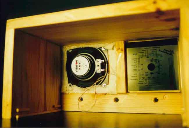 Vor dem Lautsprecher ein Stoffrest von einer Übergardine. Die Knöpfe sind Schrankknöpfe, die jedoch etwas
