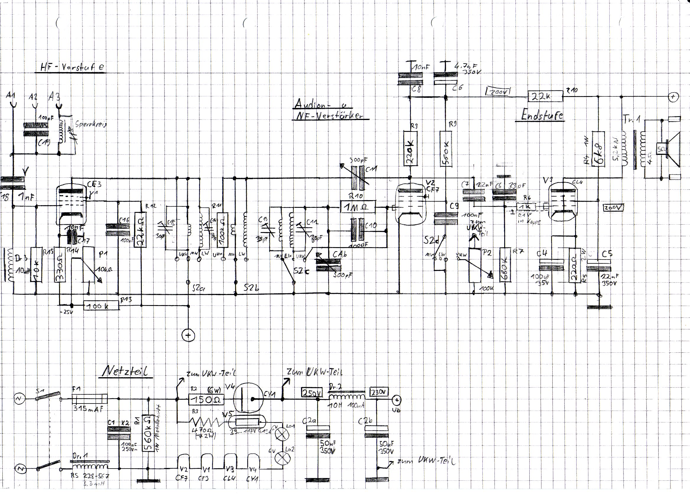 AN EVENTUELLE NACHBAUER: Wie man im Schaltplan erkennen kann, liegt ein Netzpol über Dr.1. am Chassis. Ist dieser Netzpol zufällig der Außenleiter, liegen volle 230 V niederohmig am Chassis, und auch an den metalliesierten Röhrenkolben, dem Drehko, dem Lautsprecher... Auch beim Ausschalten kann kurz Spannung anliegen, wenn der eine Schalterkontakt früher öffnet. Also BITTE sehr aufpassen, OK? Und nur über Trenntrafo betreiben.