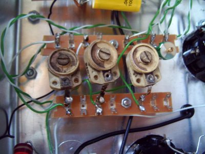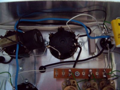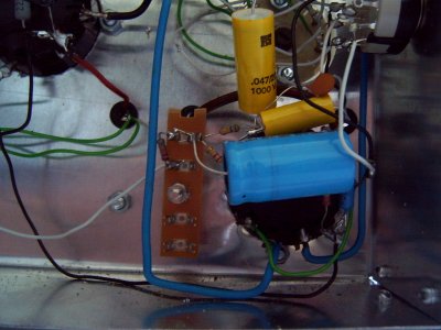 Da man bei Aussenkontaktröhren mit Quetschfuß bedenkenlos freie Fassungskontakte als Lötstützpunkt nutzen kann(bei Pressglassockeln ist das NICHT möglich, da offene Pins oft das System tragen, und die Konstruktion ist von Hersteller zu Hersteller verschieden), kam ich im Netzteilbereich ohne Lötleisten aus. Direkt am Poti unter dem Elko sieht man einen dicken 100 k Widerstand. Diese Kombination erzeugt mit P1 zusammen die Regelspannung von -2 .. -22 V für die HF-Vorstufe. Die CF3 hat eine Regelkennlinie, so das man damit den HF-Pegel wunderbar steuern kann.