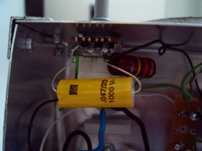 Es ist sehr wichtig für C1 einen X2-Typ zu nehmen(wie auf dem Foto zu sehen), da andere nicht für Betrieb an Netzspannung geeignet sind. Nur diese Kondensatoren halten die Impulse auf der Netzleitung von teilweise einigen kV sicher aus und sind auch brandsicher im Fehlerfall.