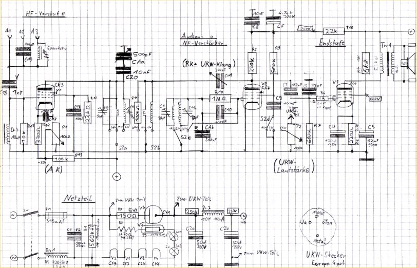 Am Audion mit CF7 ist nun eine Sache bemerkenswert, da ich ev. UKW nachrüsten will, brauchte ich einen HF Eingang. Ich dachte zunächst über eine Einschaltung eines Kathoden-Rs nach, Dann eine Umschaltung des Eingangs ... das wäre allerdings zu aufwendig geworden. So suchte ich alte Radiopläne durch und stiess auf die verblüffend einfache Lösung der Einkopplung via G2. Testen konnte ich dies noch nicht, wird aber nachgereicht. Ansonsten ist es eben ein "normales" Audion nach Datenblatt dimensioniert.