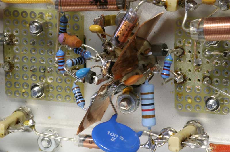 In Bild 10 und 11 sieht man den Aufbau der letzten ZF-Stufe im Detail. Um die Schwingneigung des ZF-Verstärkers in den Griff zu bekommen (denn alle drei Stufen arbeiten ja auf derselben Frequenz, bei einem Verstärkungsfaktor von insgesamt etwa 15000 !) wurden neben der Neutralisation der schädlichen Gitter-Anoden-Kapazität der EF95 (Cga = 0,02 pF !) auch eventuelle Verkopplungen der Stufen untereinander über Betriebsspannungs- und Heizleitungen durch LC-Glieder unterbunden.