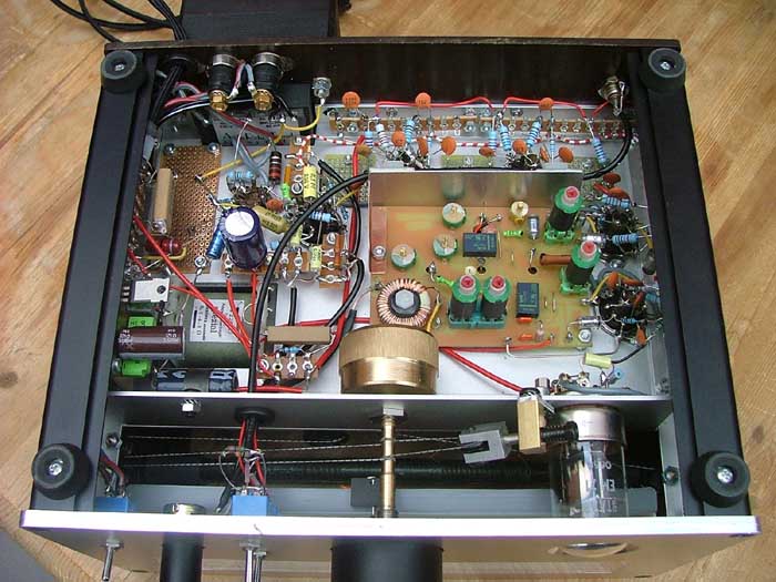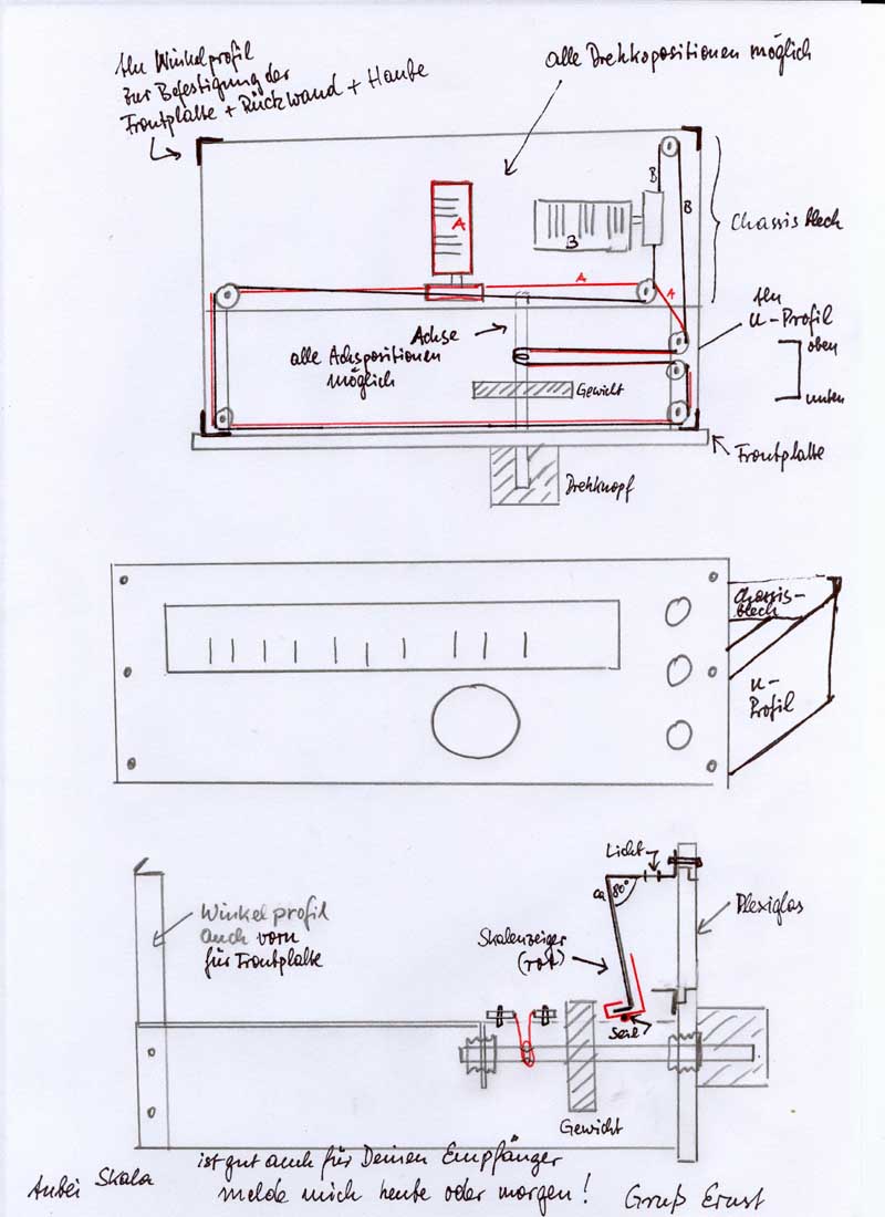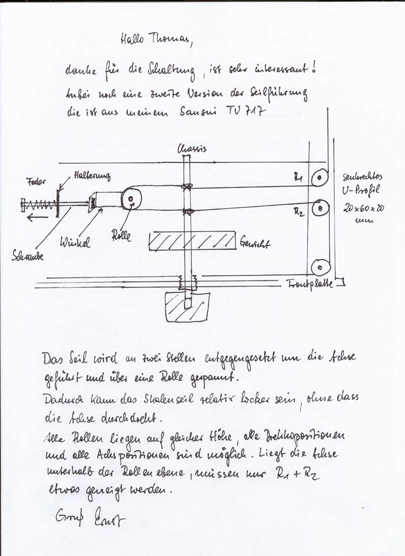 Die Seilführung ist dem Sansui TU-717 abgeschaut, ein geniales Konzept, mit dem alle Drehko- und Achspositionen realisiert werden können. Durch das gegenläufig um die Antriebsachse geführte Seil ist zudem nur eine geringe Seilspannung nötig.