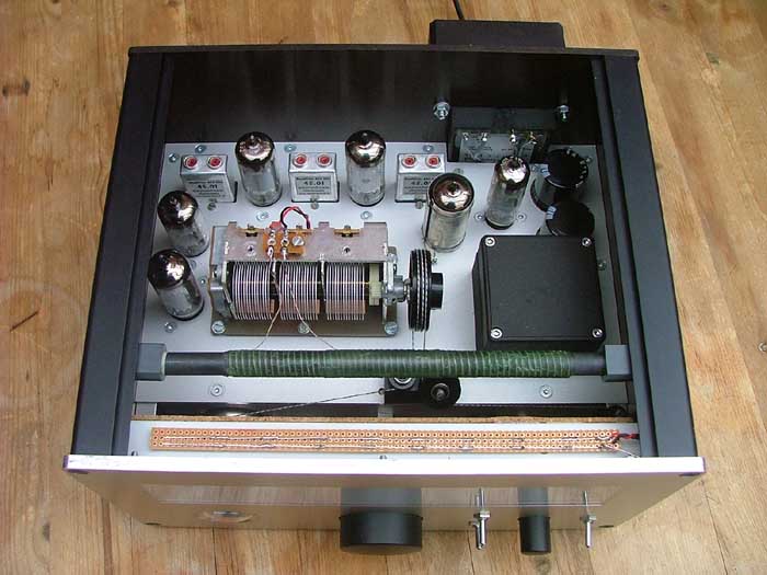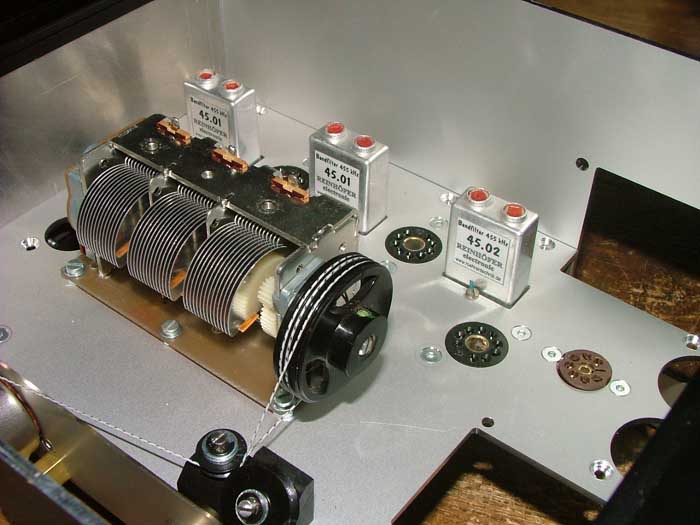 Um kürzeste Verbindungen zu erhalten, liegen alle Elemente der Eingangsschaltung, wie Antennen- Anpassungsübertrager, Bandfilter, Trimmer, Relais und Zf- Saugkreis inklusive der Oszillatorspule auf einer Platine unterhalb des Dreifachdrehkos.