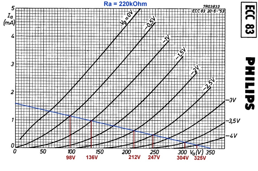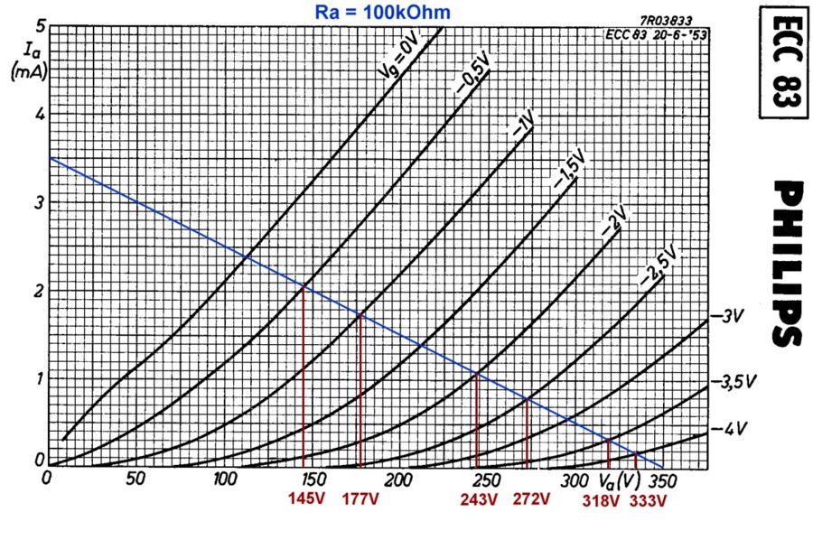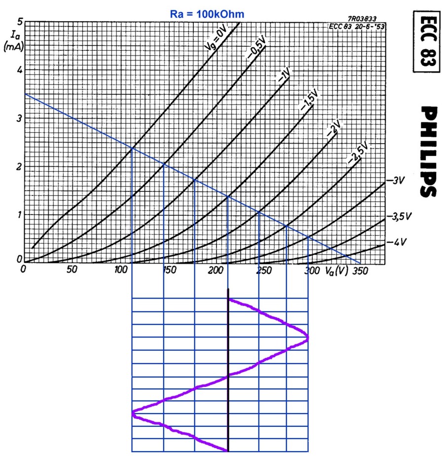 Hier ist das Datenblatt der ECC83 mit eingezeichneter Arbeitsgerade