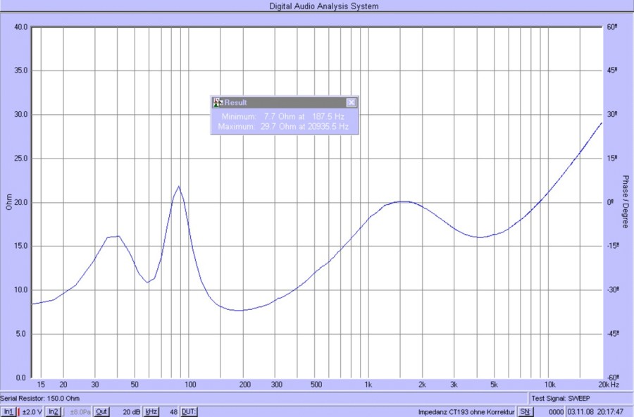 Das Impedanzminimum beträgt 7,7Ω bei 188Hz. Im für das menschliche Ohr kritischen Bereich