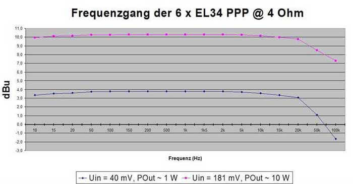 Erstaunen warf dann der Ausgangsübertrager auf. Bei 10 W Ausgangsleistung war der Frequenzgang von 20 Hz bis 20 kHz auf