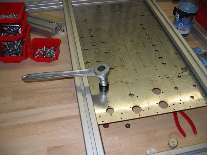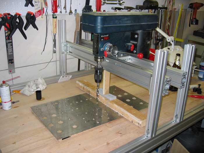 die Mitte der Platte bekommt. Ich habe mir dazu eine Portalbohrmaschine gebaut.