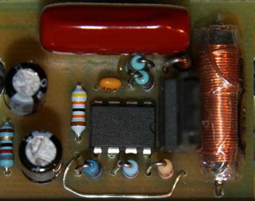 Die Schaltung (siehe oben) ist streng nach den Vorgaben des Datenblattes erstellt worden. Problematisch ist einzig die Teileauswahl. Den Siebkondensator mit 1µF habe ich aus einem alten Schaltnetzteil (immer eine Quelle feinster Bauteile!), genauso wie den Schalt-Mosfet. Sucht einen Mosfet mit möglichst kleiner Gate-Kapazität aus, sonst wird es heiß. Der von mir verwendete 2SK1808 kommt hier ohne Kühlkörper auf ca. 90 Grad. Der probierte BUZ80A war zum Wasserkochen geeignet... Auch die Drossel wird warm und sollte für mindestens 1A ausgelegt sein. Der Wandler muß etwa 18mA Strom liefern können.