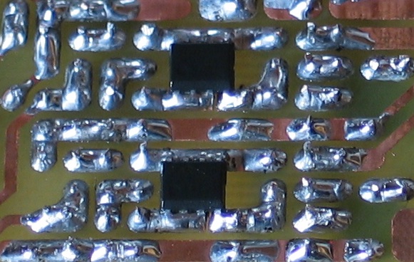 Die Mosfets sind SMD-Typen und kleben auf der Kupferseite. Im Layout muß hier noch jeweils eine Kupferbahn unterbrochen werden (siehe Foto). Die winzige Trennfuge zwischen Gate und Source des IRF7403 habe ich erst direkt vorm Einlöten der Mosfets gesetzt.