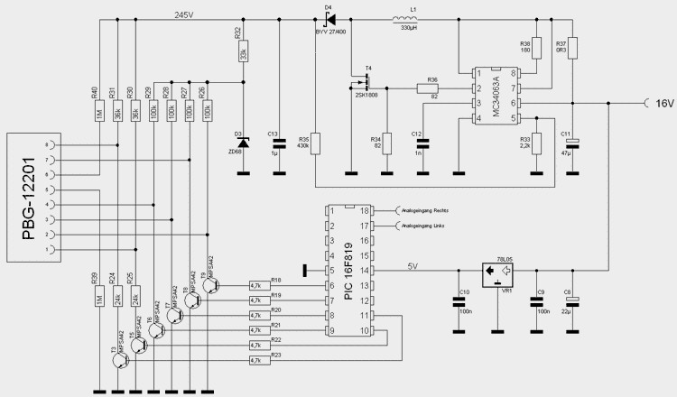 Dieser Teil der Schaltung ist ein Produkt des Forums...! Der grundsätzliche Aufbau ist zuerst von Matthias aufgezeichnet und gepostet worden. Von Oliver wurde sehr schnell ein Programm für den PIC geschrieben und im Laufe eines regen Mailverkehrs ständig verbessert.